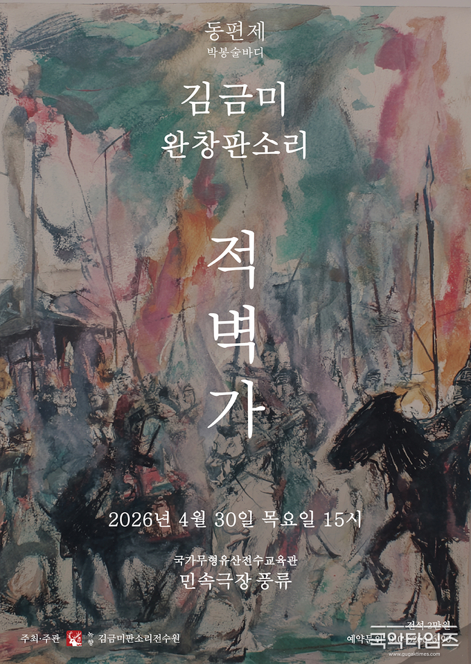판소리 다섯 바탕 가운데 가장 웅장한 서사로 손꼽히는 ‘적벽가’가 명창 김금미의 소리로 무대에 오른다. 오는 4월 30일 오후 3시, 서울 강남구 국가무형유산 전수교육관 민속극장 풍류에서 열리는 이번 공연은 동편제 박봉술 바디의 정수를 온전히 담아낸 완창 무대로 기대를 모은다.
