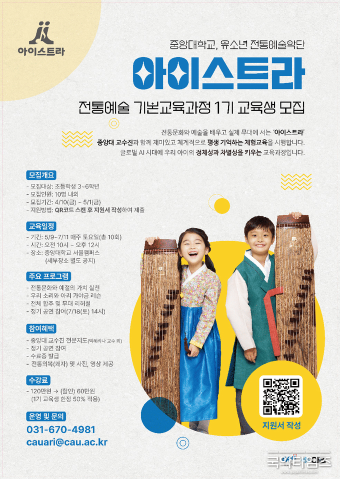 중앙대학교 학교기업 아리(Ari)가 유소년 전통예술악단 ‘아이스트라’의 전통예술 기본교육과정 1기 교육생을 모집한다. 단순한 취미 교육을 넘어 전통문화 속에서 아이들의 정체성과 감수성을 키우는 교육 프로그램으로 주목된다.